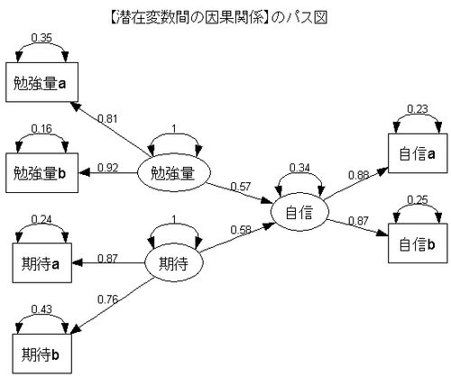 昨日はGraphVizが上手く動かなかったのでパス図の描画は割愛しましたが、EasyGraphVizで描画に成功したので記録しておきます。 library(sem) 勉強量a <- c( 5, 4, 4, 5, 4, 5, 5, 6, 4, 4, 3, 6, 5, 8, 5, 5, 6, 4, 3, 4, 6, 4, 3, 3, 6, 3, 5, 5, 3, 3) 勉…